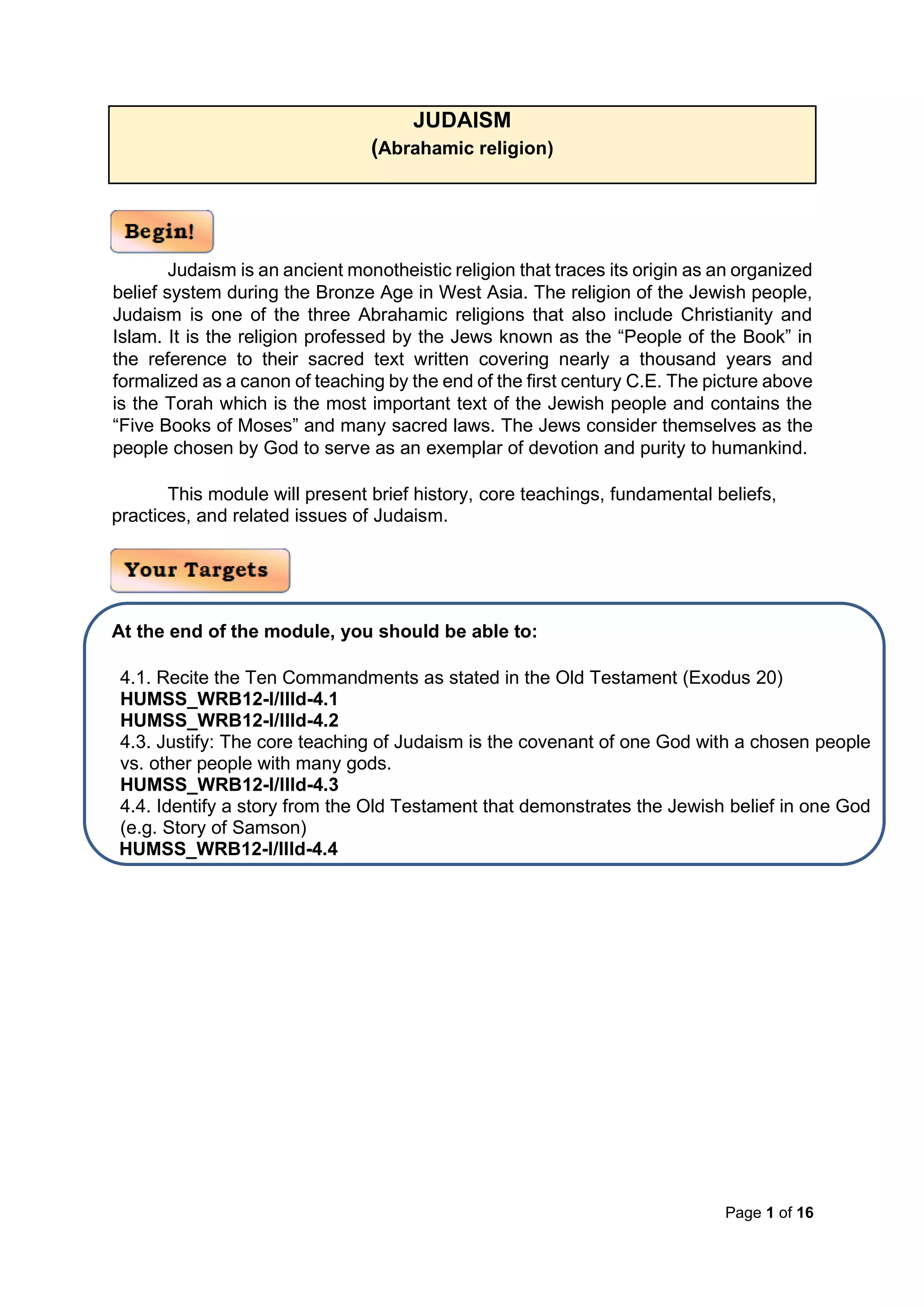 This document provides an overview of Judaism as taught in a religious studies module for senior high school students. It begins with learning objectives focused on core teachings of Judaism, including reciting the Ten Commandments and justifying Judaism's core teaching of monotheism. The document then provides background on the origins and history of Judaism, key beliefs and sacred texts, important figures like Abraham and Moses, holy days and festivals, and synagogues. It aims to give students a foundational understanding of Judaism's brief history, fundamental beliefs, and practices.