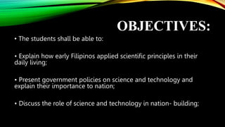 2. Early Filipinos applied scientific principles like agriculture and herbal medicine. During Spanish colonization, formal education in science and technology began but was limited by beliefs.