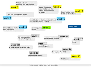 This document discusses how social media became the main source of information about the Israel-Gaza conflict due to restrictions on traditional media access. It provides examples of YouTube videos, tweets, blogs and online games used by both sides to share information and perspectives with the global public. The document also examines how social media can function as a public forum and tool for political activism and debates issues around objectivity and narrative framing in user-generated content from conflicts.