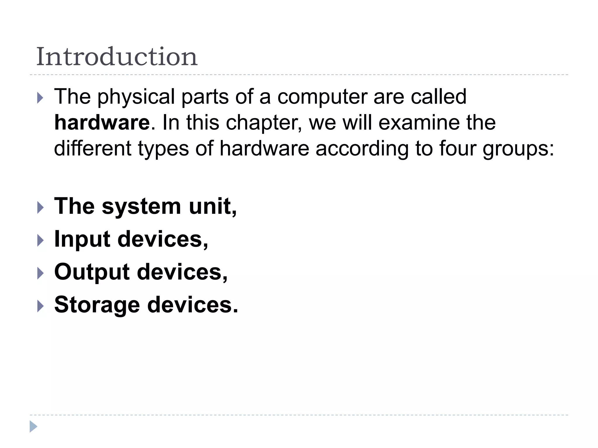 The physical components of a computer can be grouped into four categories: the system unit, input devices, output devices, and storage devices. The system unit houses the main computer components including the motherboard, CPU, RAM, expansion cards, and connections for other components. The motherboard serves as the central component that connects the other parts of the computer including storage devices, expansion cards, and buses that allow communication between all components.