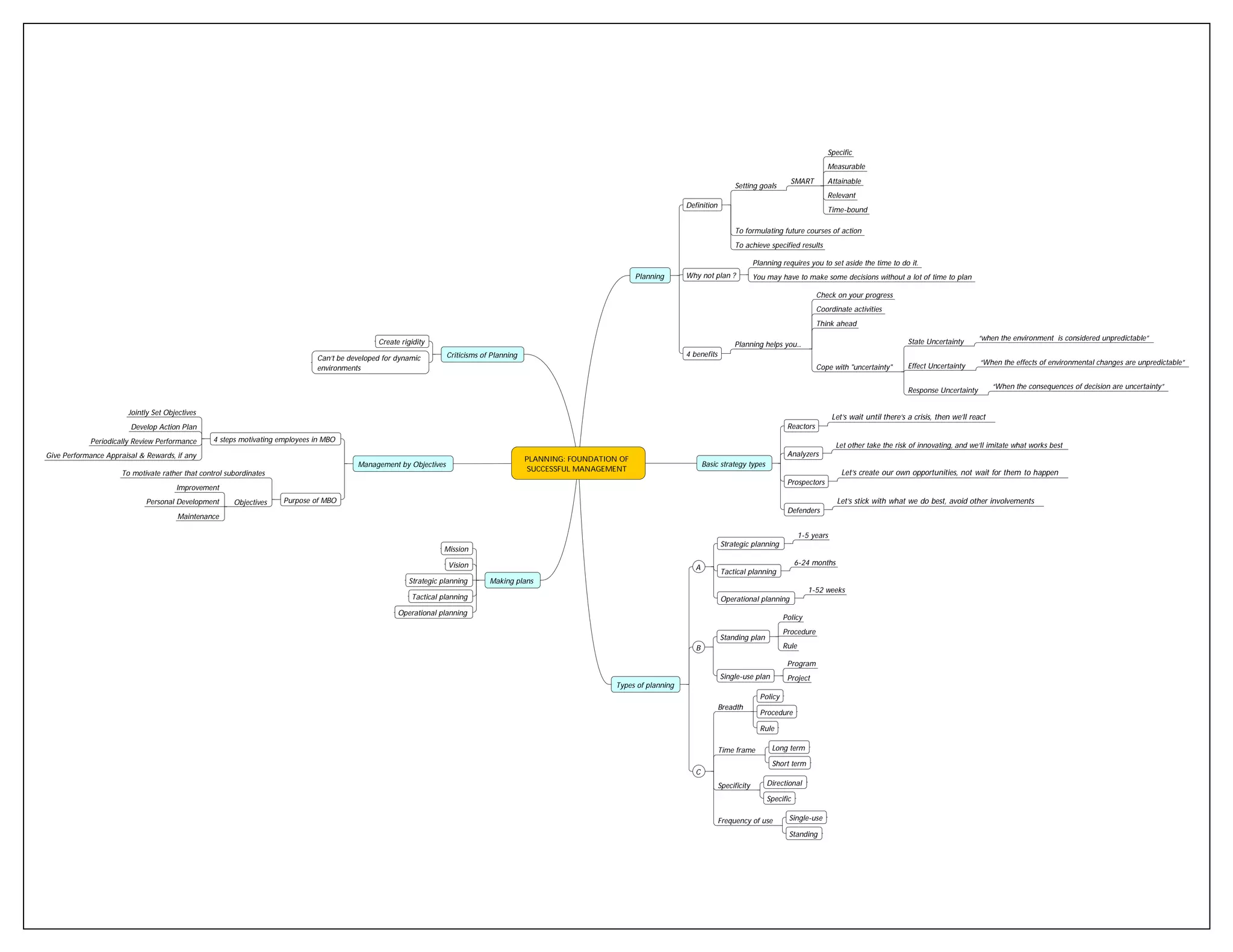 Planning involves setting SMART goals that are specific, measurable, attainable, relevant, and time-bound. It requires setting aside time to formulate future courses of action to achieve specified results. Planning helps by allowing you to check progress, coordinate activities, and think ahead. However, criticisms of planning include that it can create rigidity and not be developed for dynamic environments with state, effect, and response uncertainty. The document discusses management by objectives as a way to motivate employees through jointly setting objectives, developing action plans, and periodically reviewing performance. It also outlines the basic strategic types of prospectors, analyzers, defenders, and reactors in relation to planning.