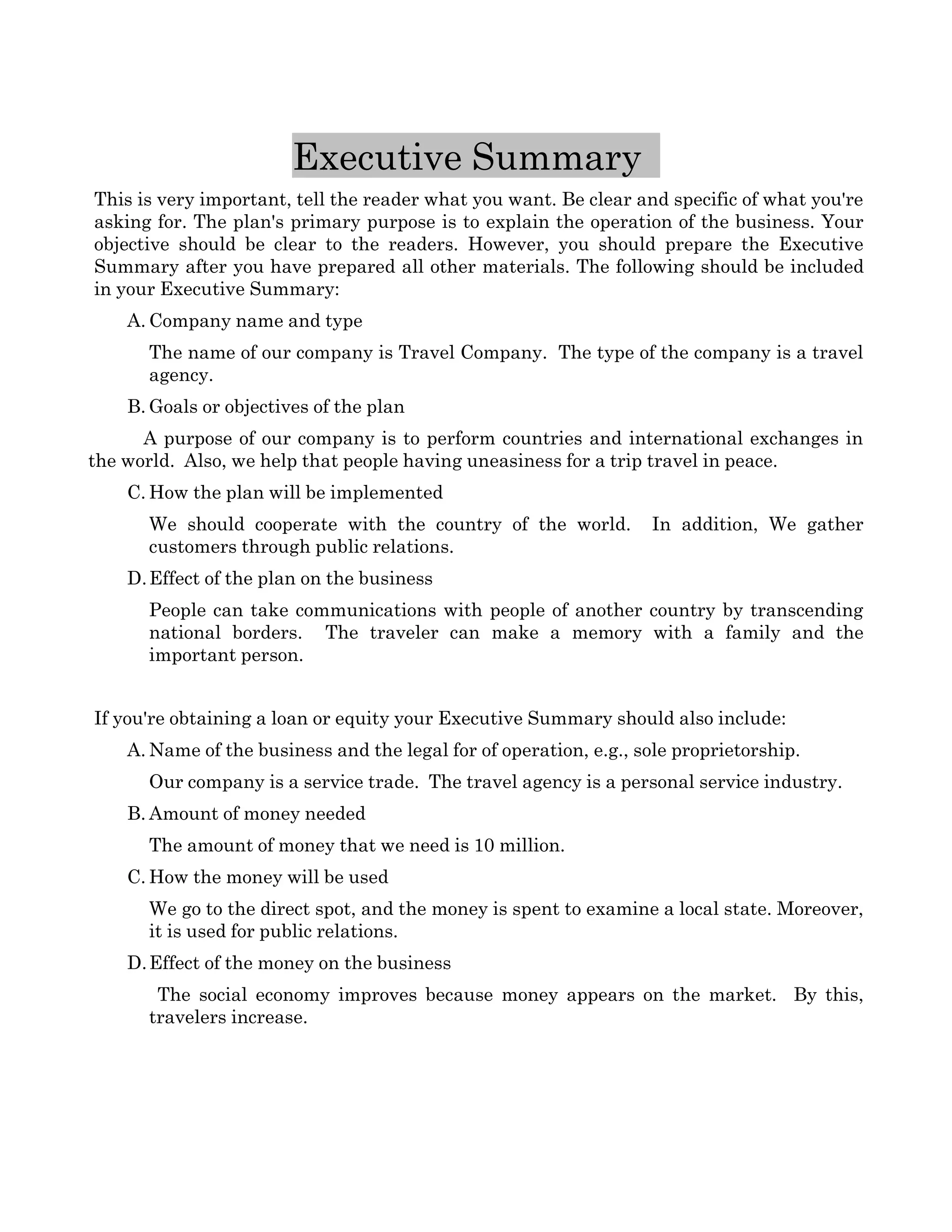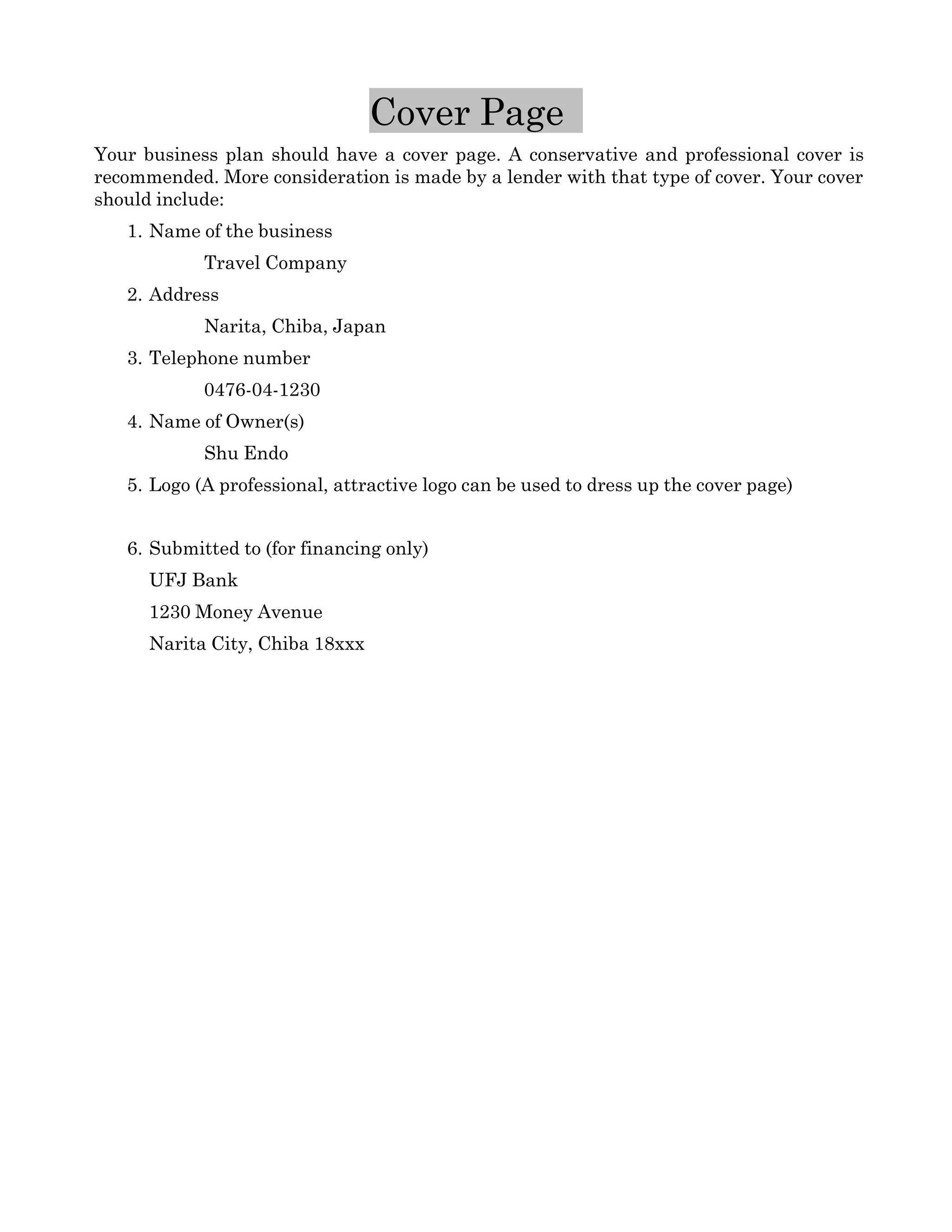 The document provides information for creating a business plan cover page and executive summary for a proposed travel agency called Travel Company. The cover page should include basic identifying information like the business name, address, phone number, owner's name, and logo. The executive summary introduces the company and travel agency business, states the goals of expanding international travel offerings and improving customer experience, and describes how the business will operate through partnerships and marketing. It requests 10 million yen in funding to directly examine local areas and conduct public relations to attract more travelers and grow the social economy.