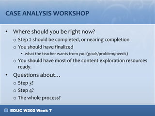 The document discusses the steps and requirements for a case analysis assignment. It provides guidance for steps 3 and 4 of the process - selecting appropriate technologies to address the needs identified in the case, and explaining the step-by-step process and use of technologies. Students are encouraged to finalize their analysis of the teacher's needs, justify their technology choices, and ensure their proposed solution actually addresses the needs described in the case. The case analysis is due next week and should be embedded in the student's e-portfolio.