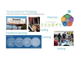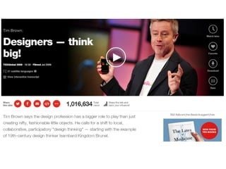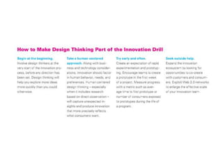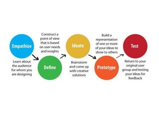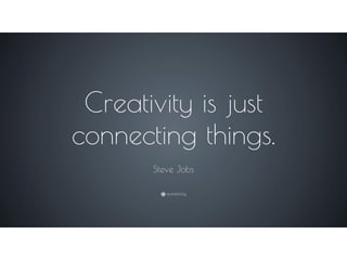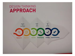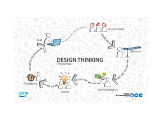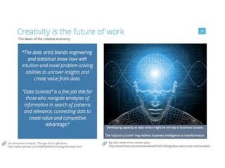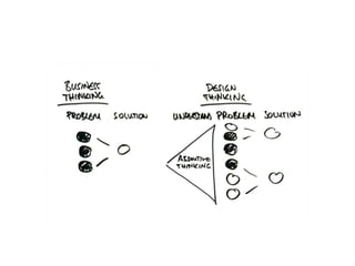 This document discusses design thinking and how it relates to data and creativity. It provides an overview of design thinking as a process that balances analytical thinking and intuitive thinking. It also discusses how design thinking can be applied to business processes and problem solving. Additionally, it explores how data and creativity can work together, noting that creativity separates humans from animals and involves adapting nature to solve problems. The document advocates for educational systems that encourage students to use existing knowledge to address new challenges independently.