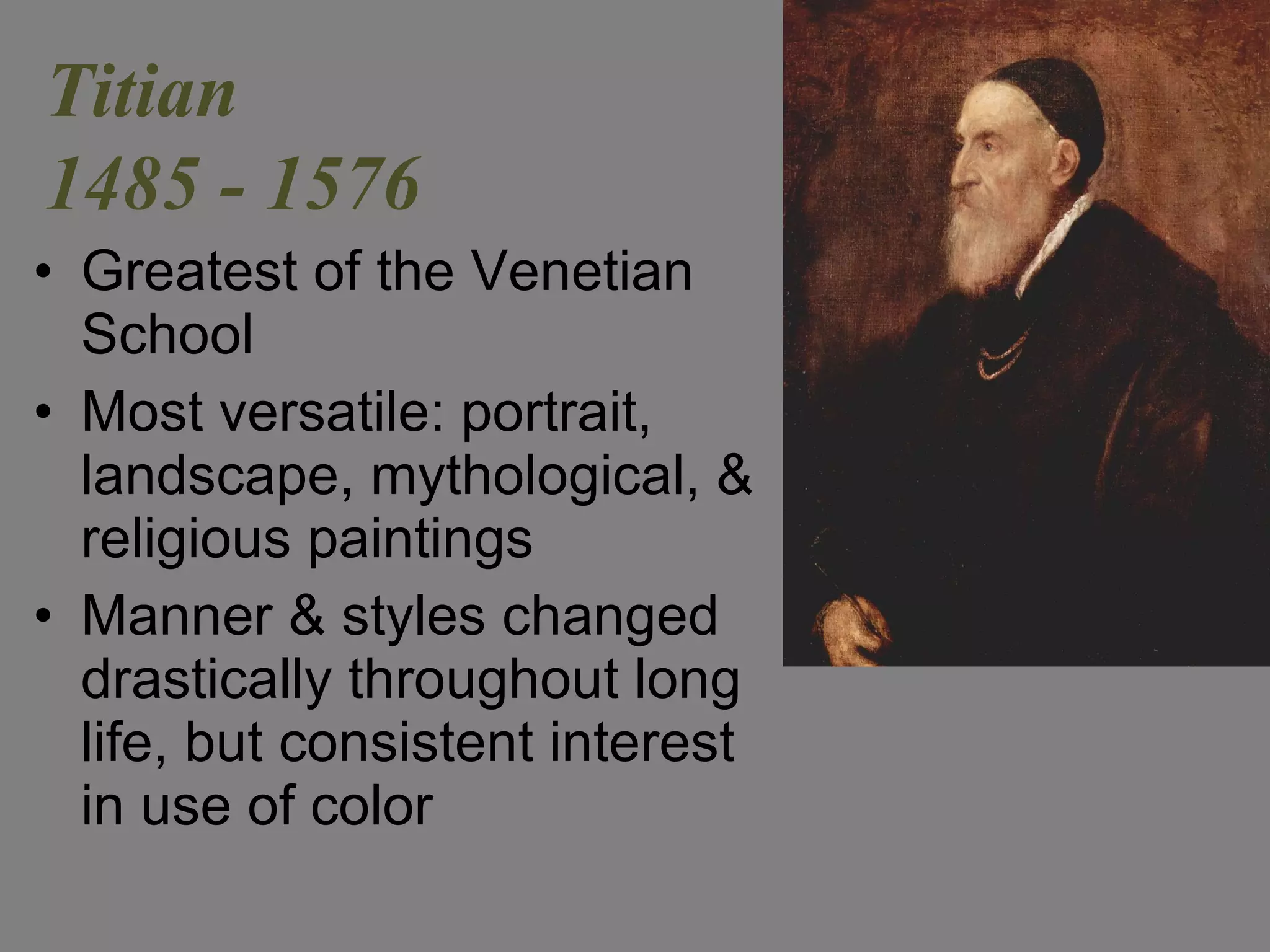 The document provides an overview of the Italian Renaissance artist Titian, known for his versatility in genres including portraits, landscapes, mythological and religious paintings. It discusses how his style changed throughout his long career but his consistent emphasis on color remained. Key works mentioned include Assumption of the Virgin and Venus of Urbino. Context is provided on stylistic developments like Mannerism and the Baroque period that followed the Renaissance.