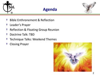 The document discusses the themes of the three days of a Cursillo weekend. Day one focuses on an encounter with self through reflections on grace and one's relationship with God. Day two emphasizes an encounter with Christ through learning how to see Christ and developing a personal relationship with Him. Day three is centered around an encounter with others by considering one's environments and call to spread the gospel through actions and as a Christian leader. The order and themes of the rollos are meant to facilitate moving through these three encounters over the course of the weekend.
