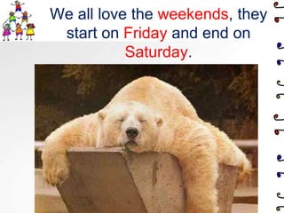 The document discusses different activities that children enjoy doing on weekends and in their free time. It mentions going to the mosque on Fridays, visiting grandparents, going to the club to play with friends, swim, ride bikes and scooters, feed ducks, and play in the playground sliding down slides or swinging. It also talks about going to shopping malls and parks, playing sports, and different hobbies like playing with toys, stuffed animals, cars, dolls, playing computer games, reading, flying kites, riding bikes and scooters.