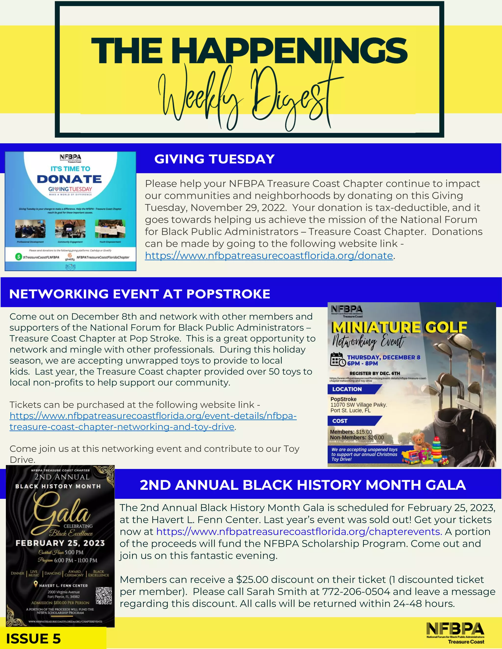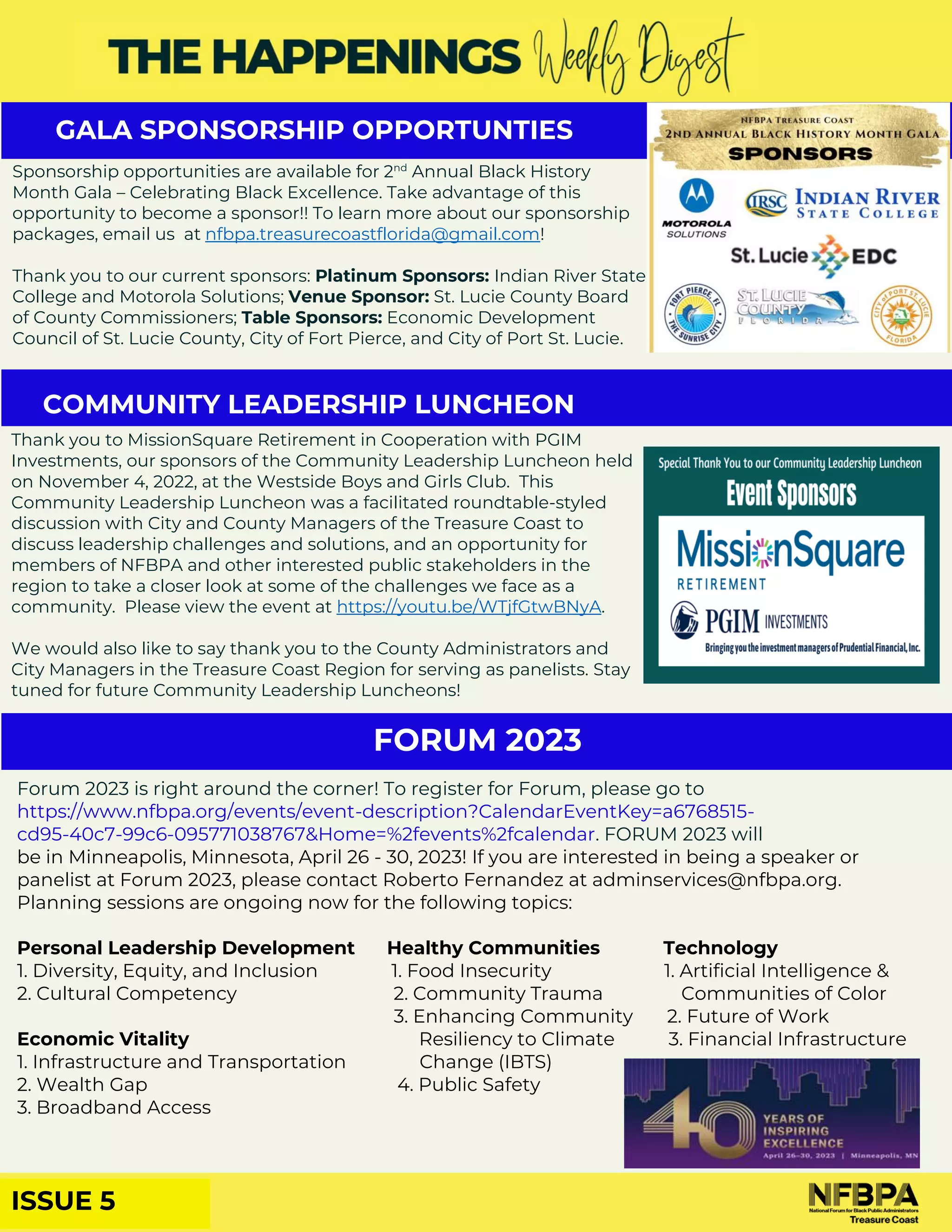 The document outlines events and initiatives by the NFBPA Treasure Coast Chapter, including a Giving Tuesday donation request, a networking event on December 8, and the 2nd Annual Black History Month Gala on February 25, 2023. The chapter also held a Community Leadership Luncheon to discuss local leadership challenges and has upcoming Forum 2023 in Minneapolis from April 26-30, 2023. Additionally, sponsorship opportunities for the gala are available, with details provided for interested parties.
