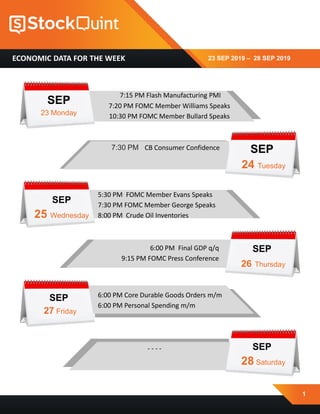 This document provides a summary of key economic data and events for the week of September 23-28, 2019. It includes the dates and times of releases such as manufacturing and consumer confidence reports, FOMC member speeches, and crude oil inventory data. It also contains disclaimers about the limitations of the information and advises users to do additional research before making investment decisions.