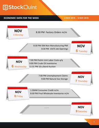 This document provides a summary of key economic data being released during the week of November 4th through November 9th, 2019. It lists the date and time of each data release, including factory orders, ISM Non-Manufacturing PMI, JOLTS job openings, unit labor costs, crude oil inventories, and other indicators. It also provides a disclaimer noting that Stockquint.com is not responsible for investment decisions made based on the information and that past performance is not a guarantee of future returns.