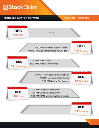 This document provides a summary of key US economic data being released during the week of December 9th through December 14th, 2019. It lists the date and time of each data release, including the NFIB Small Business Index, Core CPI, Crude Oil Inventories, FOMC Economic Projections, Unemployment Claims, Natural Gas Storage, Core Retail Sales, and a speech by FOMC Member Williams. It also includes a disclaimer about investment risks and states that Stockquint does not provide investment advice.