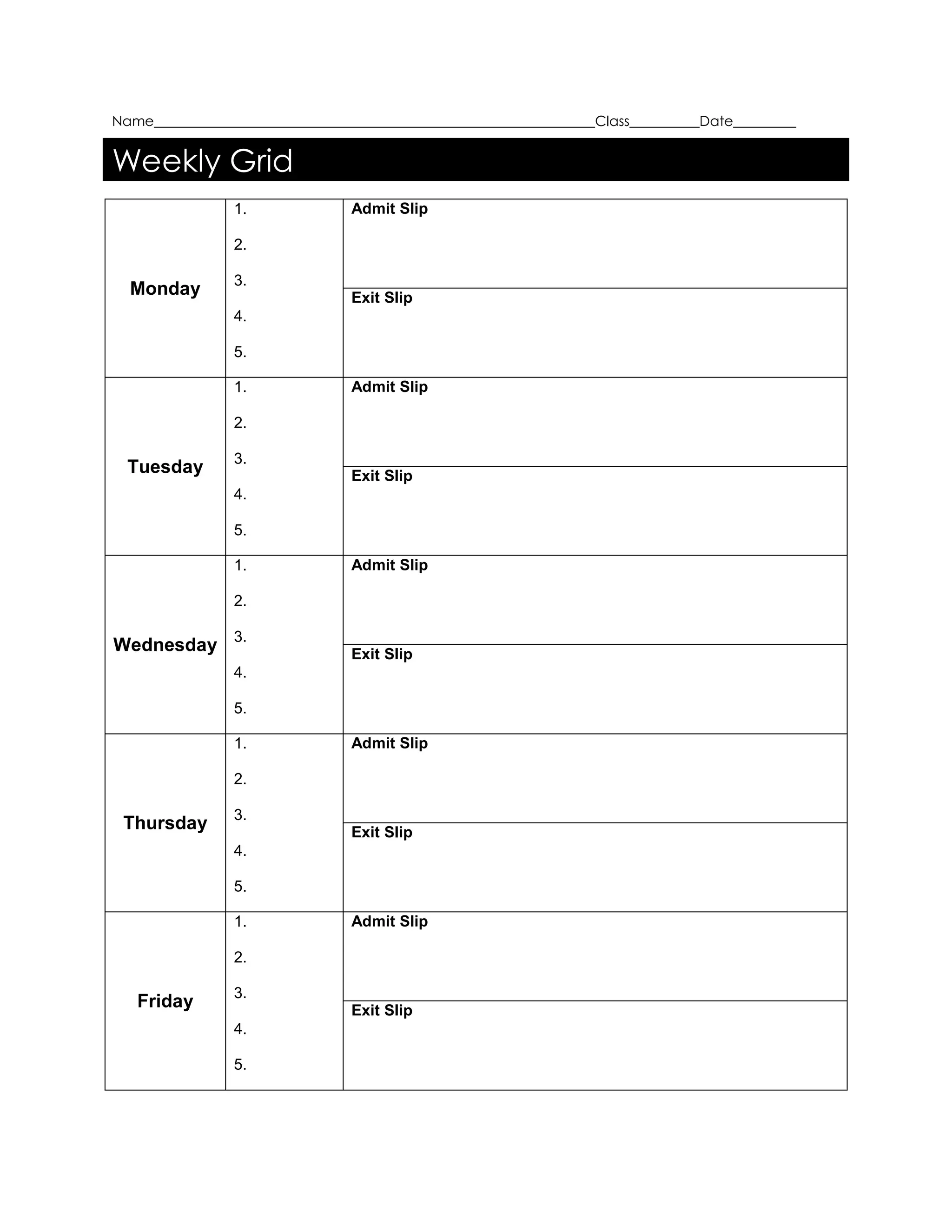 This document contains a weekly schedule grid for a student. The grid includes spaces for the student's name, class, and date. It then lists the days of the week Monday through Friday. For each day, there are 5 lines to write assignments or activities for that day, along with a line each for an admit slip and exit slip. This grid allows a student to plan out their weekly assignments and activities.