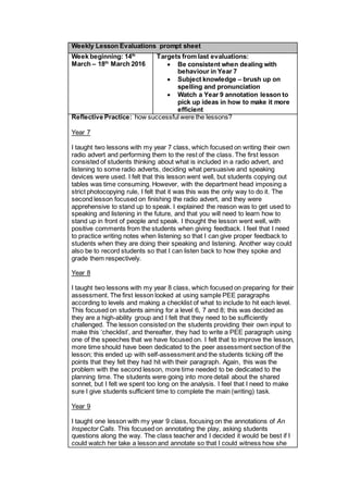 The document is a weekly lesson evaluation from a teacher reflecting on lessons taught the previous week. For a Year 7 class, the teacher felt a lesson on writing radio advertisements went well but the copying of tables took too much time. For a Year 8 class preparing for an assessment, the teacher realized more time should have been spent on peer assessment and planning. After observing another teacher's annotation lesson, the teacher plans to improve their own annotation lessons by maintaining better pace. The key action points are to give students more time for writing tasks, find ways to better record and provide feedback on student speaking, and develop a faster pace when annotating texts.