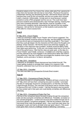 The document contains weekly lesson evaluations and reflections from a teacher over the course of one week. The teacher taught multiple year groups and subjects. Some key reflections included needing more preparation when using new technology like Nearpod and ensuring clear expectations are set when using iPads. Setting ground rules and modeling appropriate discussion techniques could have improved a forum theatre lesson with one class. Overall, the teacher aimed to implement more independent learning and develop a more literary approach in future lessons.