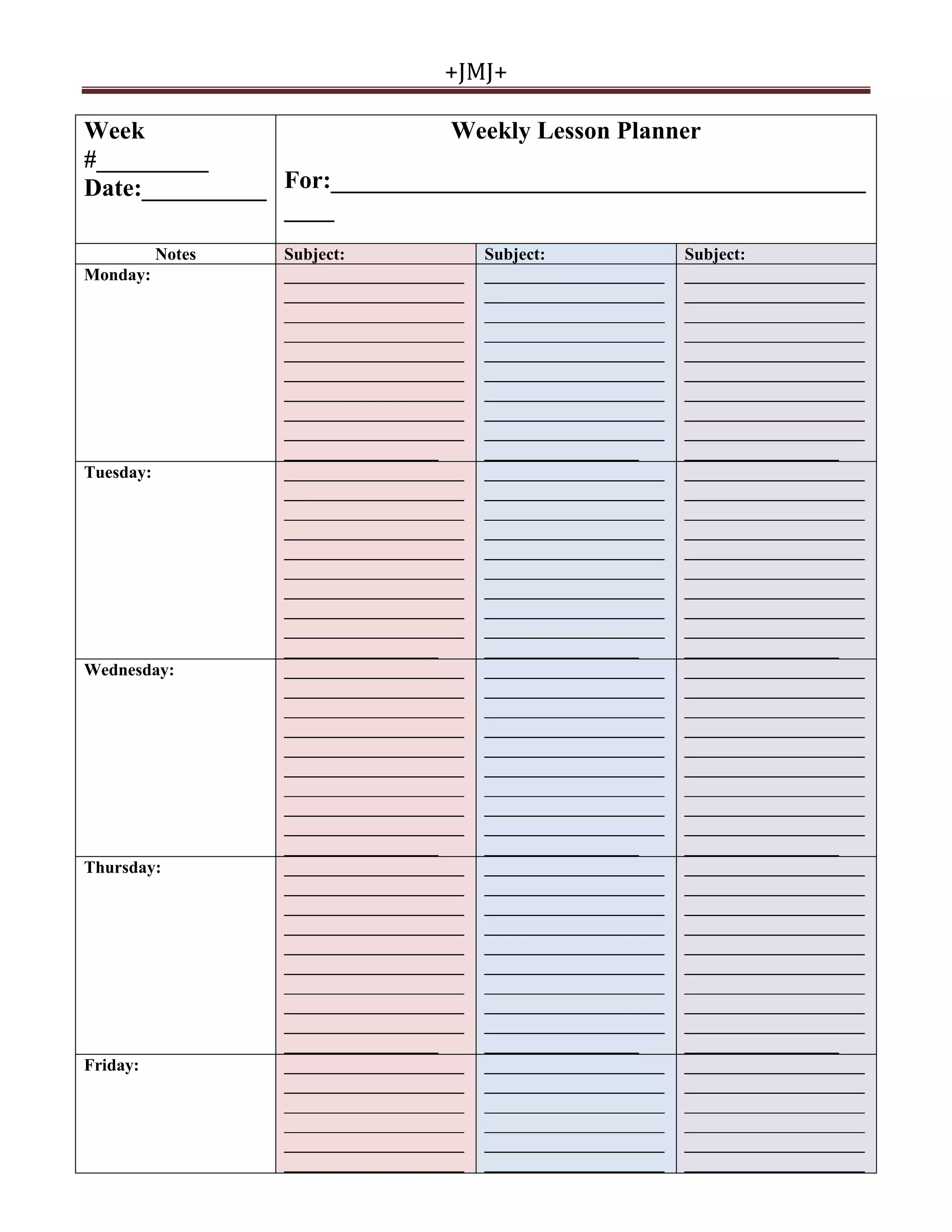This weekly lesson planner outlines the subjects and notes for each day of the school week. Monday through Friday are listed with space provided to write in the subject and details for each class that day. The planner is meant to help organize the lessons, topics, and notes for a single school week.
