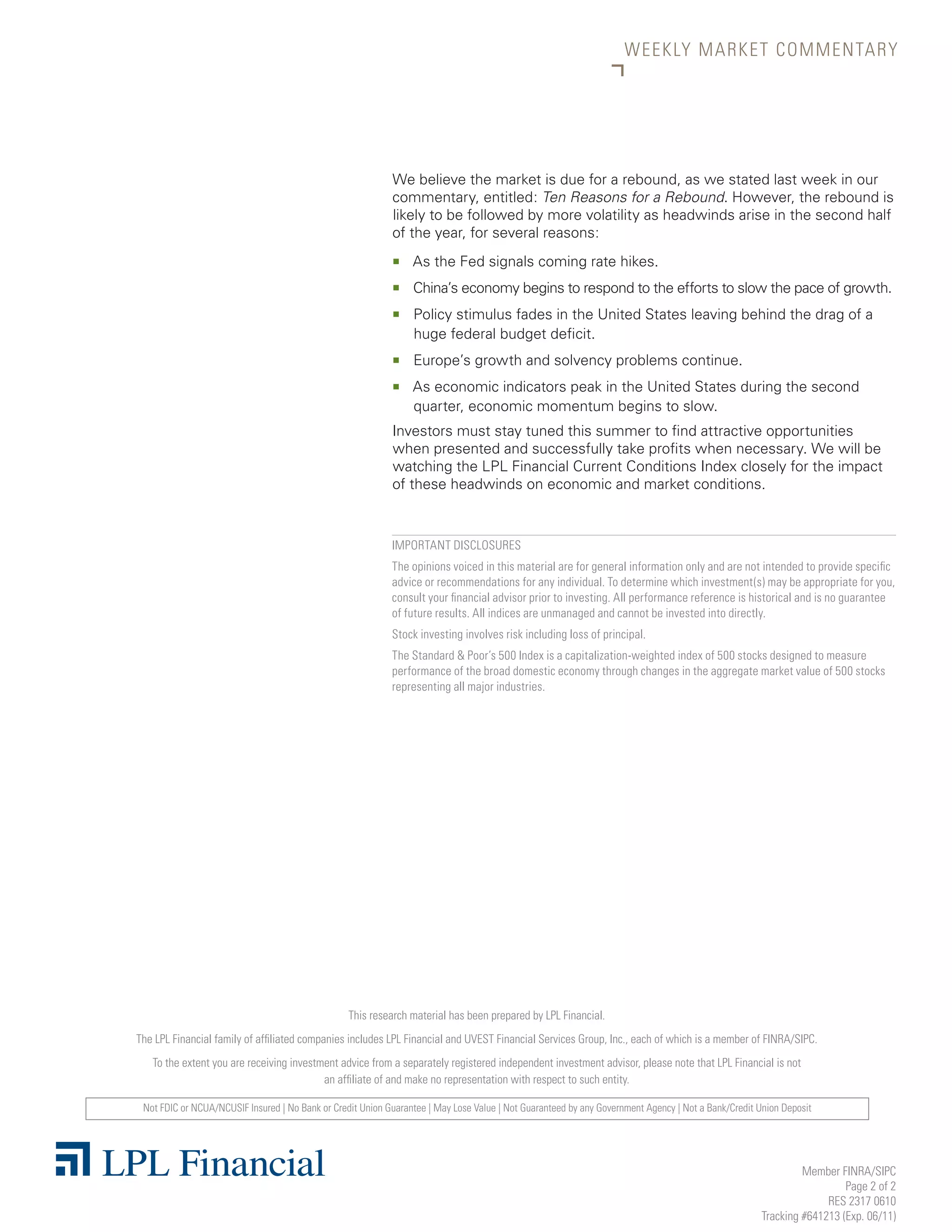 The document discusses the old adage of "sell in May and go away" and argues that investors should instead "buy in June and stay tuned" in 2010. It notes that while stock returns have historically been weaker from May to October, returns are still positive about two-thirds of the time. Given that a pullback has already occurred, the author believes investors should buy stocks now rather than sell. However, investors need to "stay tuned" to changing economic conditions in the coming months as headwinds may increase volatility.