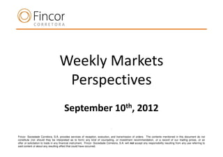 The document is a weekly market perspectives report from Fincor- Sociedade Corretora, S.A. dated September 10th, 2012. It provides a summary of recent economic events and data in Europe and the US, as well as previews of key events and data expected for the coming week. Specifically, it discusses the ECB's new bond-buying program, weak economic data from Europe and the US, expectations for further monetary easing from the Fed, and suggests buying shares of the Portuguese bank BES.