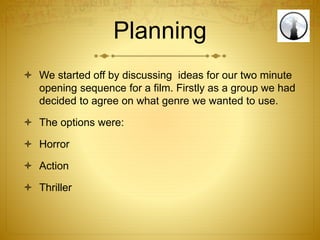 The document contains weekly meeting notes for a film production group. It discusses planning their opening sequence in the action genre, assigning roles, scheduling filming during half terms, acquiring permission and rehearsing. They discuss budgets, equipment, filming and re-filming shots. Their final meetings note they've completed filming and editing is nearly finished.