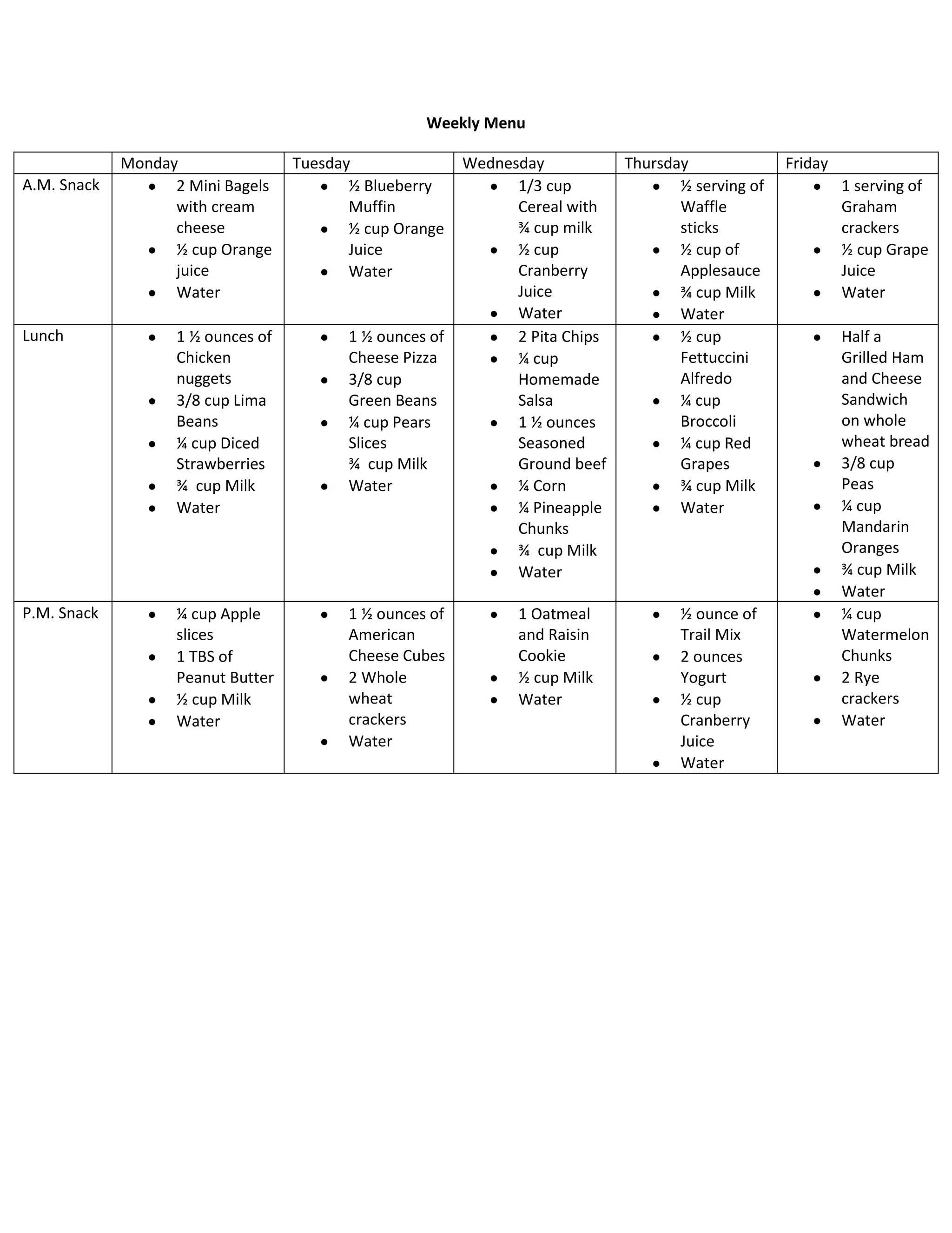 The document provides a weekly menu including snacks and meals for Monday through Friday. For morning snack on Monday there is listed mini bagels with cream cheese and orange juice. Lunch on Monday includes chicken nuggets, lima beans, diced strawberries, and milk. The afternoon snack for Monday is apple slices with peanut butter and milk. Meals and snacks are similarly listed for the remainder of the week including items like cheese pizza, fettuccini alfredo, grilled ham and cheese sandwich, oatmeal cookies, trail mix, and watermelon.