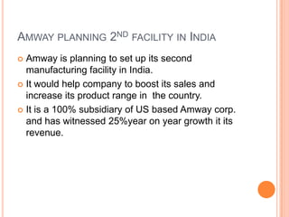 Amway is planning to set up a second manufacturing facility in India to boost sales and increase its product range as it has seen 25% annual revenue growth. Shares of capital goods firms may rise this week as industrial output exceeded estimates in July. Ford plans to launch 8 new models in India by mid-decade and make India an export hub as the auto market grows fast. The Sensex hit 19,000 after 32 months as investors chase returns in emerging markets with low interest rates in developed nations.