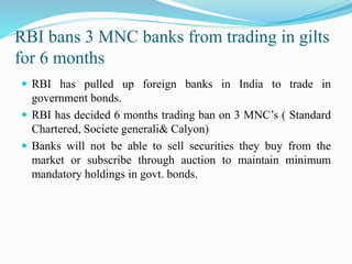 RBI bans 3MNC banks from trading in gilts for 6 months  RBI has pulled up foreign banks in India to trade in government bonds.  RBI has decided 6 months trading ban on 3 MNC’s ( Standard Chartered, Societe generali& Calyon)  Banks will not be able to sell securities they buy from the market or subscribe through auction to maintain minimum mandatory holdings in govt. bonds.