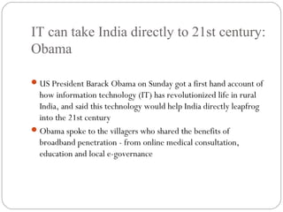US President Barack Obama visited rural India and saw how information technology has improved lives, allowing access to education, healthcare, and local governance online. The Reserve Bank of India increased interest rates by 0.25% during its quarterly meeting. Menswear retailer Koutons plans to open 100 new outlets on Friday for its youth brand Charlie Outlaw. Major companies like Reliance, Bharti Enterprises, and Tata Group are investing heavily in India's growing retail sector through new stores and partnerships.