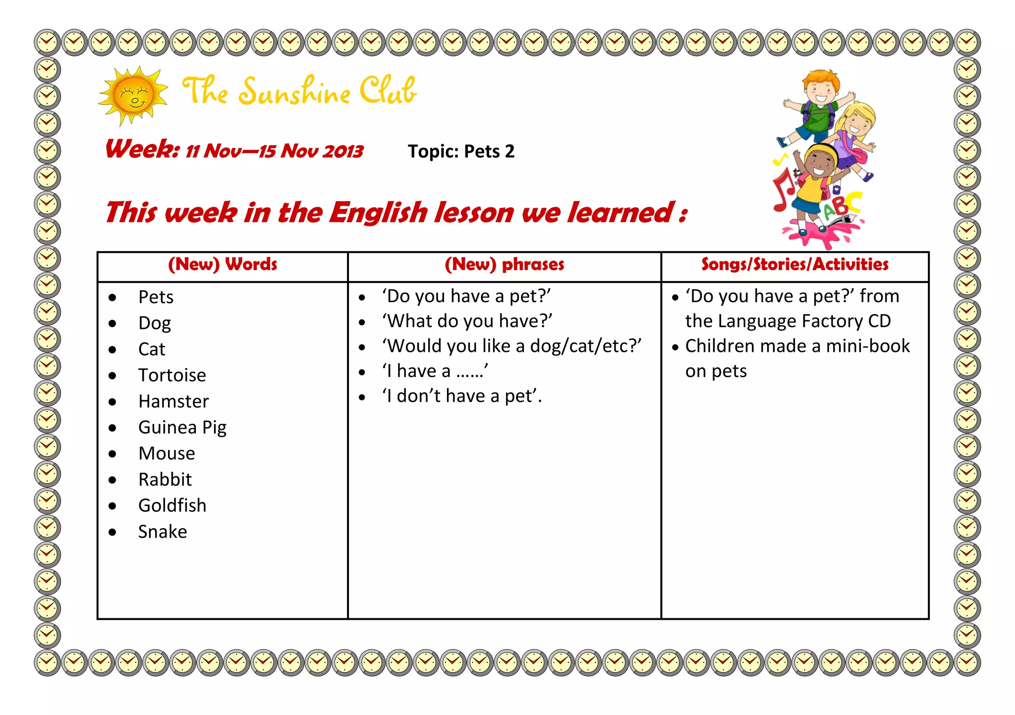 This week's English lesson for the Sunshine Club focused on pets. New vocabulary included different types of pets like dog, cat, tortoise, hamster, guinea pig, mouse, rabbit, and goldfish. Phrases taught were questions about pets ownership and responses like "I have a..." and "I don't have a pet". Students listened to the song "Do you have a pet?" and made a mini-book about pets.
