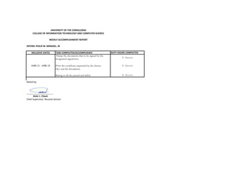 Philip M. Mirasol, Jr. completed an internship from June 11 to June 15 at the University of the Cordilleras College of Information Technology and Computer Science. During this time, he spent 8 hours stamping documents for signatures, 8 hours printing certificates for clients, and 8 hours dry sealing documents. His supervisor, Aster L. Claver, Chief Supervisor of the Records Section, noted his weekly accomplishments.