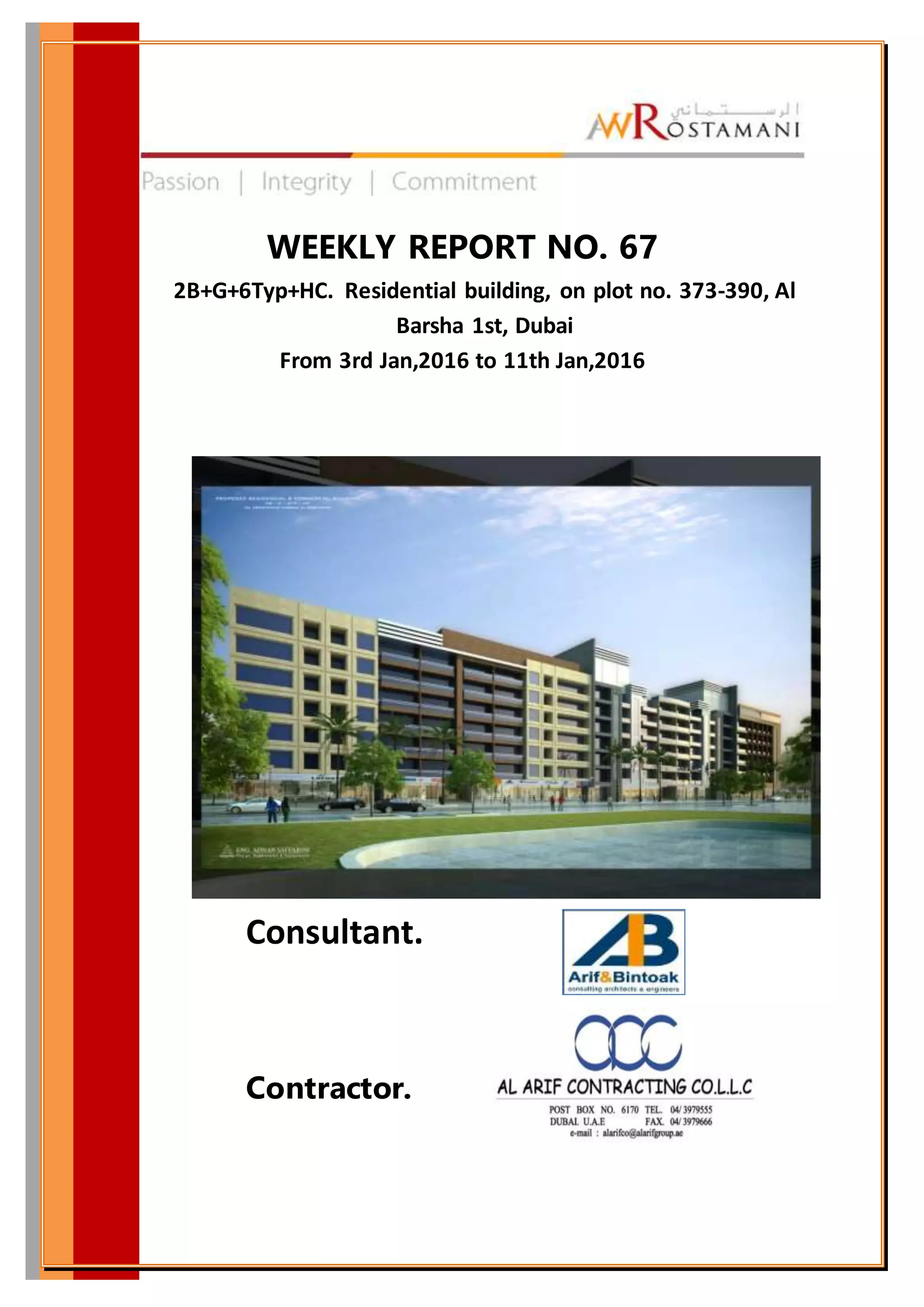 This weekly report summarizes progress on a residential building project in Dubai from January 3-11, 2016. Key updates include: