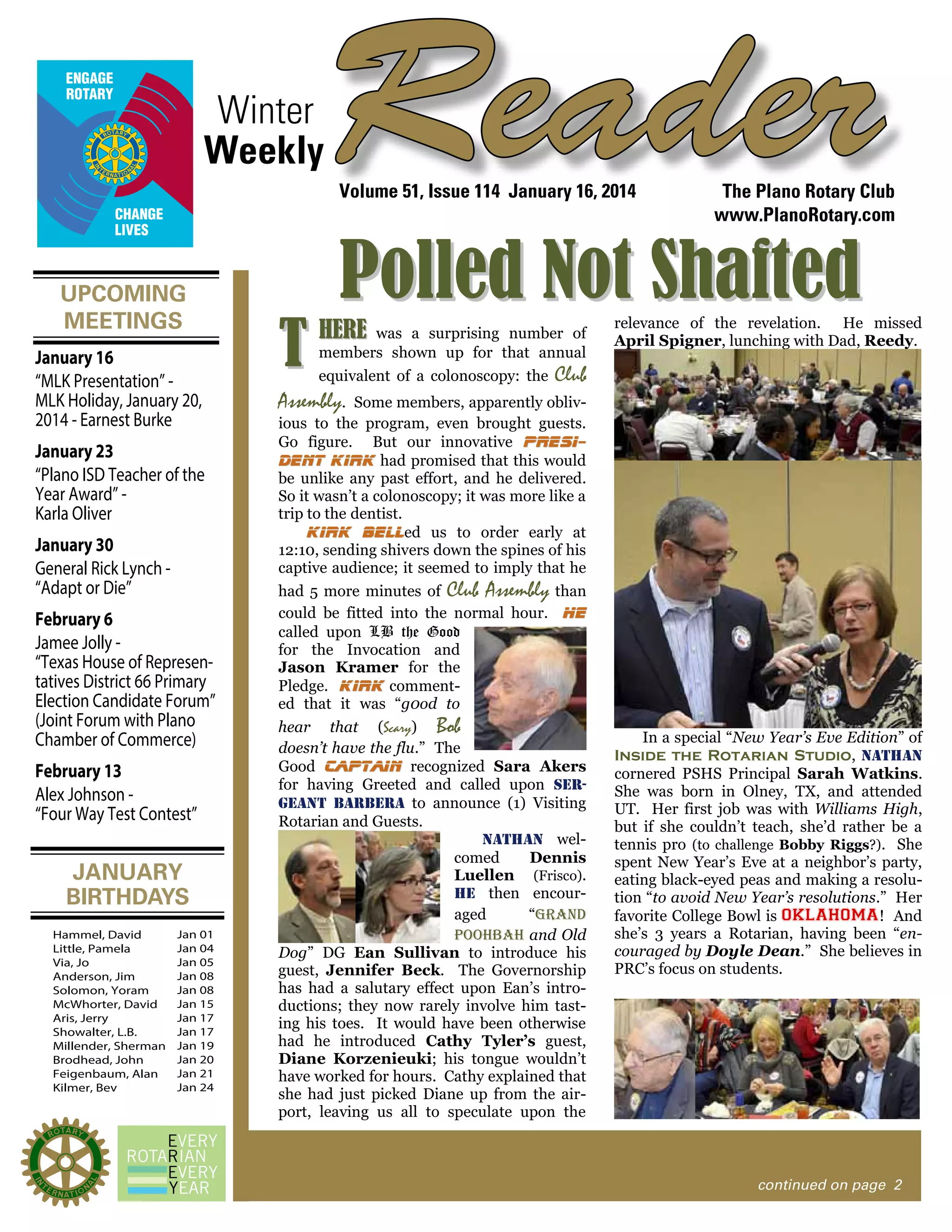 The Plano Rotary Club held its annual Club Assembly meeting on January 16th. Members discussed the direction of the club and provided suggestions, including focusing on fewer large charitable projects, increasing social events and young professional membership, and reviving past projects. The meeting featured guest speakers discussing upcoming events and a report on the club's accomplishments from the past year. Members broke into small groups to discuss questions and provide feedback to club leadership.