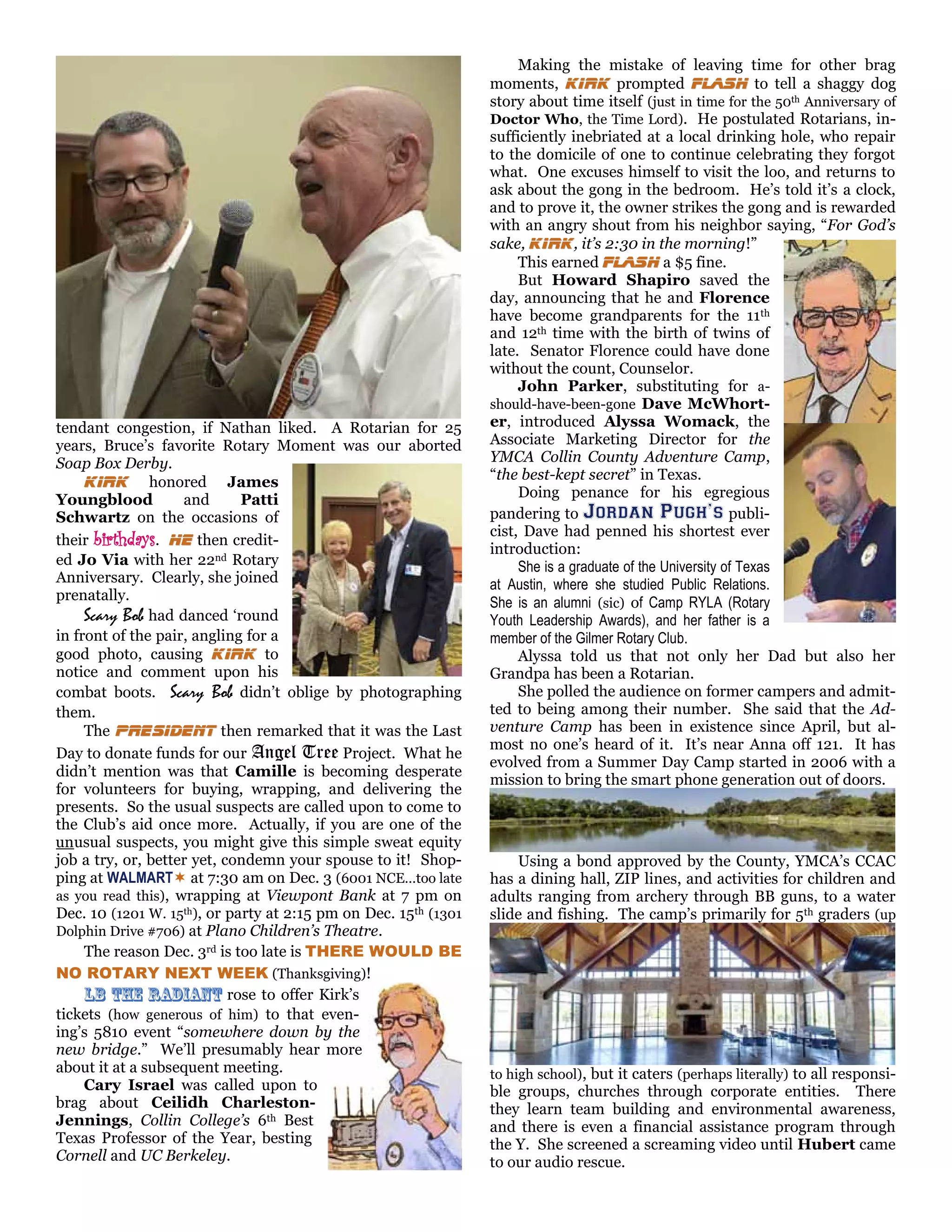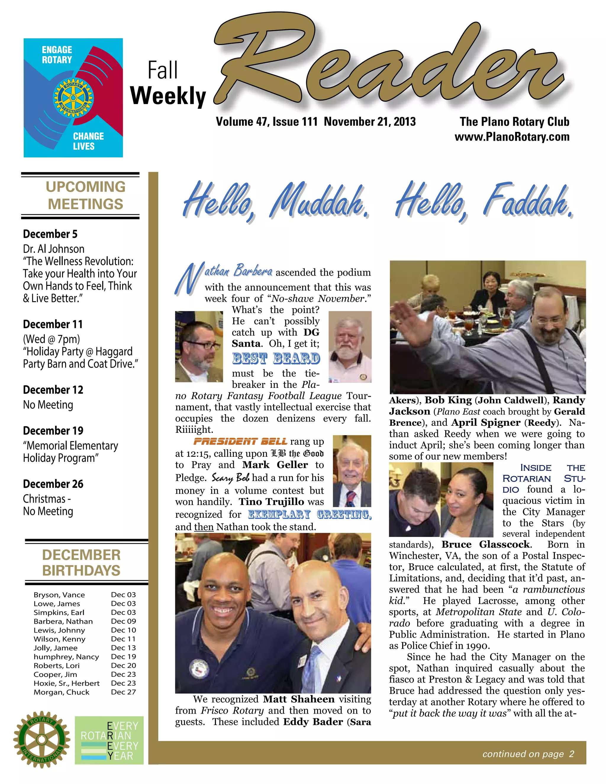 This document is the weekly bulletin for the Plano Rotary Club. It provides information about upcoming meetings and speakers, including health and wellness topics. It also summarizes the previous meeting, recognizing visitors, new members, and birthdays. The main speaker discussed the Adventure Camp run by the YMCA, which provides outdoor activities for children to encourage healthy living and combat obesity.