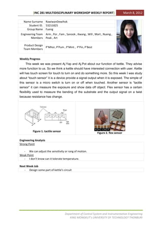 This weekly report summarizes the progress of a student group working on a smart kettle project. The group studied touch sensors to add an interactive element to the kettle. They looked at tactile and flex sensors and how they output signals when touched or bent. The report notes the sensors allow adjusting sensitivity but does not know their temperature tolerance. The group's job for next week is to design part of the kettle's circuit.