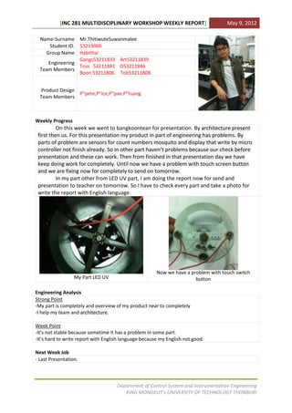 The document is a weekly report from an engineering student working on a multidisciplinary project. It provides an update on the group's recent presentation and the status of each team member's work. The student reports that during the presentation some sensor and display parts were not finished. They have been working to complete these and are now focusing on fixing issues with the touch screen buttons. For their own part involving LED UV lights, the student is writing an English report to submit. Their strengths are that most of their work is complete but the design is not fully stable yet. Their weakness is writing reports in English due to language challenges. Next week they will focus on the final presentation.