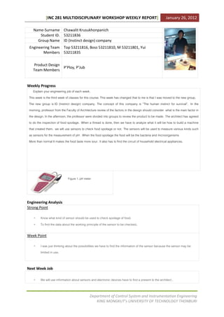 This weekly report summarizes the progress of a student design group working on a food spoilage detection machine. In the third week, the student was moved to a new group called ID Company focused on how human instincts aid survival. The group agreed to design a machine using sensors to detect food spoilage by measuring changes in pH levels and microorganisms. The student's tasks for the next week are to research sensors and present information to the project architect.