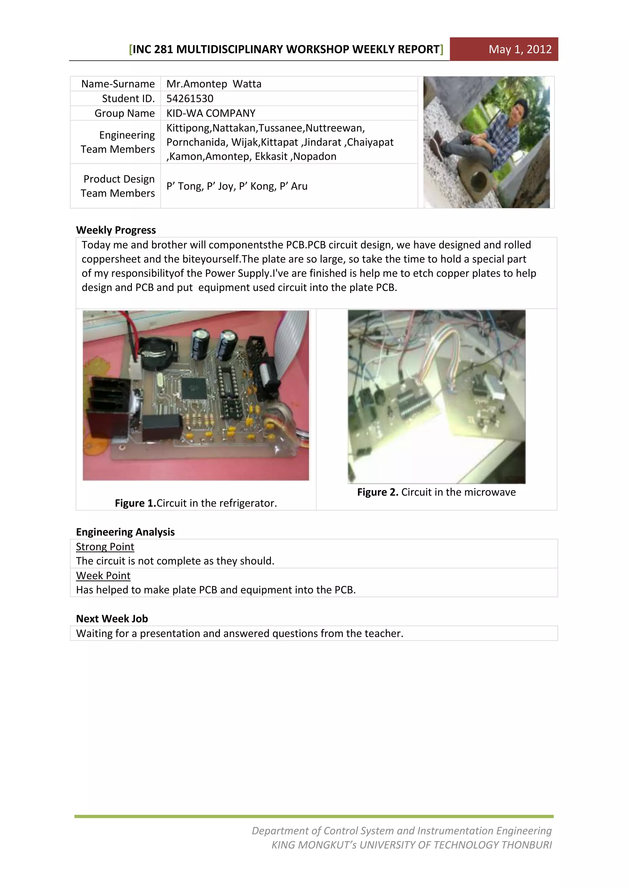 The weekly report summarizes the progress of the KID-WA COMPANY engineering team. This week, team member Amontep Watta helped with componenting the PCB circuit board by designing and etching the copper sheet. Figures 1 and 2 show circuit designs for a refrigerator and microwave. The engineering analysis found that the circuit is not yet complete. Next week, the team will prepare for a teacher presentation and question answering.