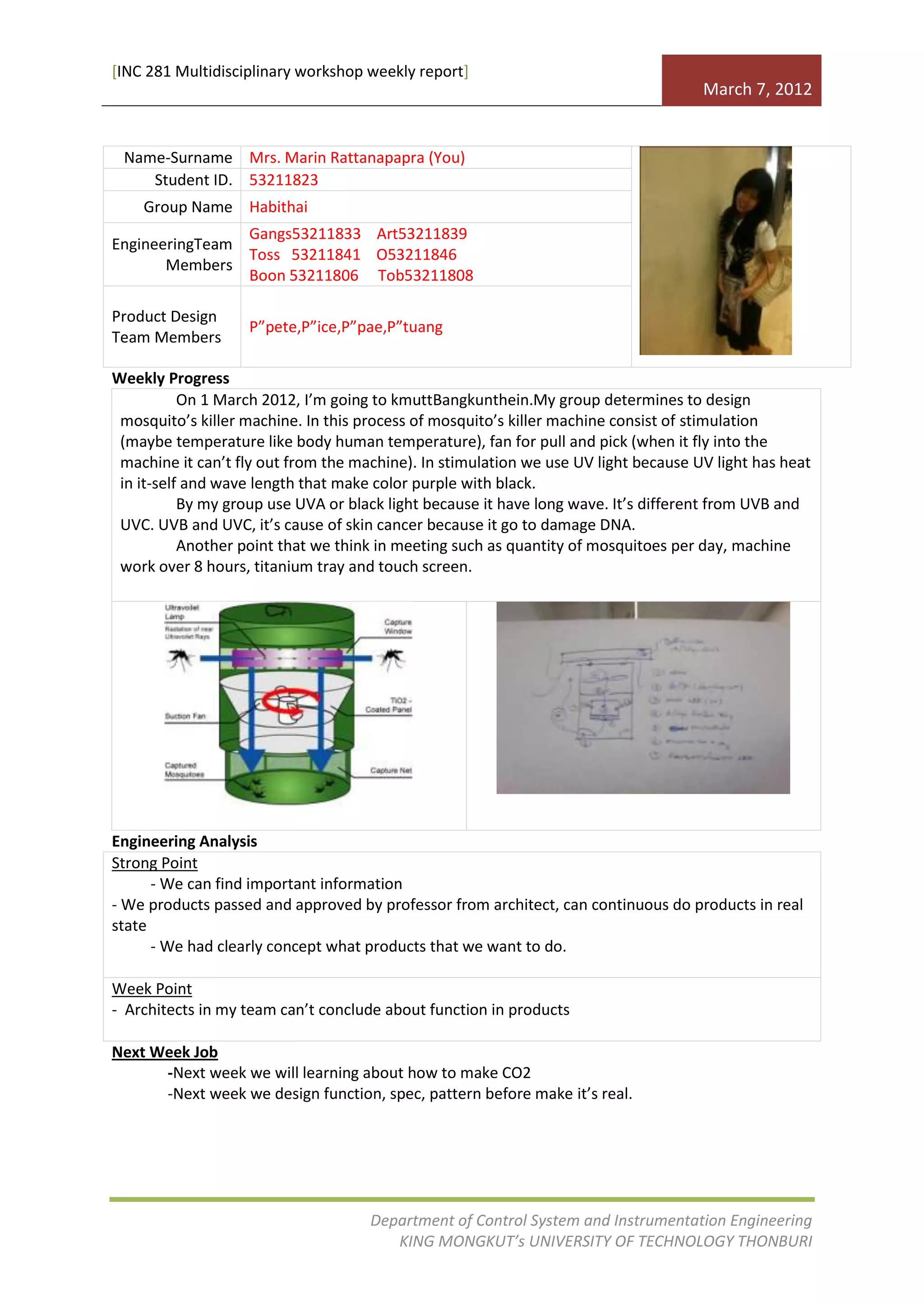 This weekly report summarizes the progress of a student group working on designing a mosquito killing machine. In the first week, the group determined their design would use stimulation like heat and UV light to attract mosquitoes into a fan system that would not allow them to escape. They discussed using UVA black light which has a long wavelength that does not damage DNA like UVB and UVC. In upcoming weeks, the group plans to learn how to produce CO2 as an attractant and further design the machine's functions, specifications, and patterns before building a prototype.