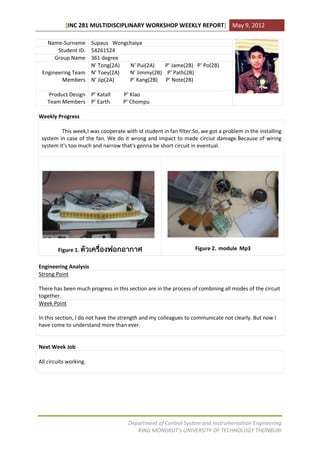 This weekly report summarizes the progress of an engineering student group called 361 degree. It discusses issues with installing a fan filter system that caused circuit damage due to wiring being too narrow. The engineering analysis section notes that circuits are being combined but communication between members needs improvement. The next week's goal is to have all circuits working.