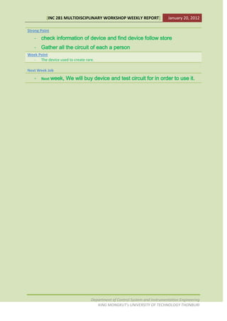 This weekly report summarizes the progress of the Bork-Kron-Thai engineering team. It discusses that the team members shared the work each person is doing, and that the author learned about triac and isolation circuits. The author designed two circuits using an MOC3041 optoisolator triac driver and a MAC4DHM triac device. Next week, the author plans to purchase devices and test circuits.