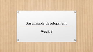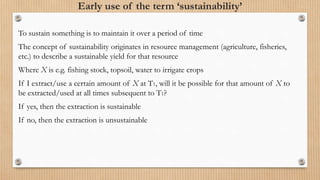 1. The origins of sustainability in resource management and its adoption by the Brundtland Commission to mean "development that meets the needs of the present without compromising the ability of future generations to meet their own needs."