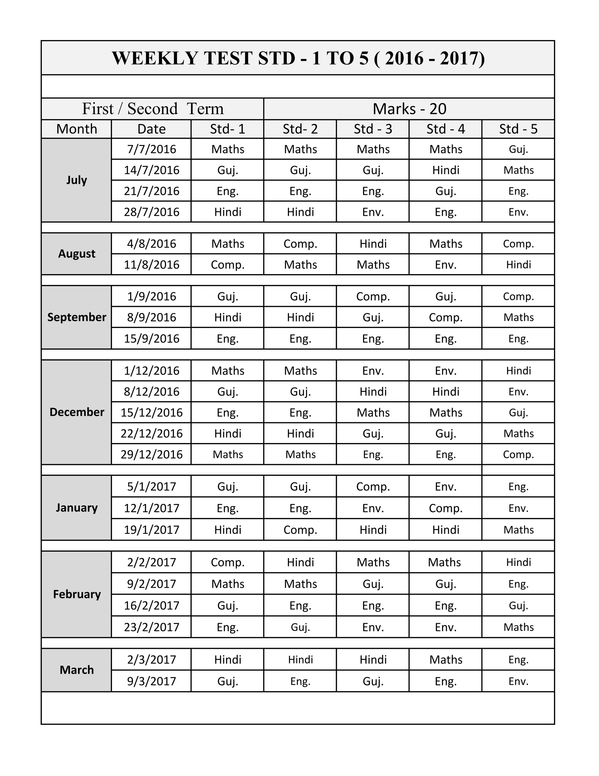 The document shows the weekly test schedule for 5 standards (Std 1 to Std 5) from July 2016 to March 2017. It lists the subject of each test for every week by standard. For example, in the first week of July (7/7/2016), the test subjects were Maths for Std 1 to Std 4 and Gujarati for Std 5. The tests covered various subjects including Maths, Gujarati, Hindi, English, Computer and Environment.