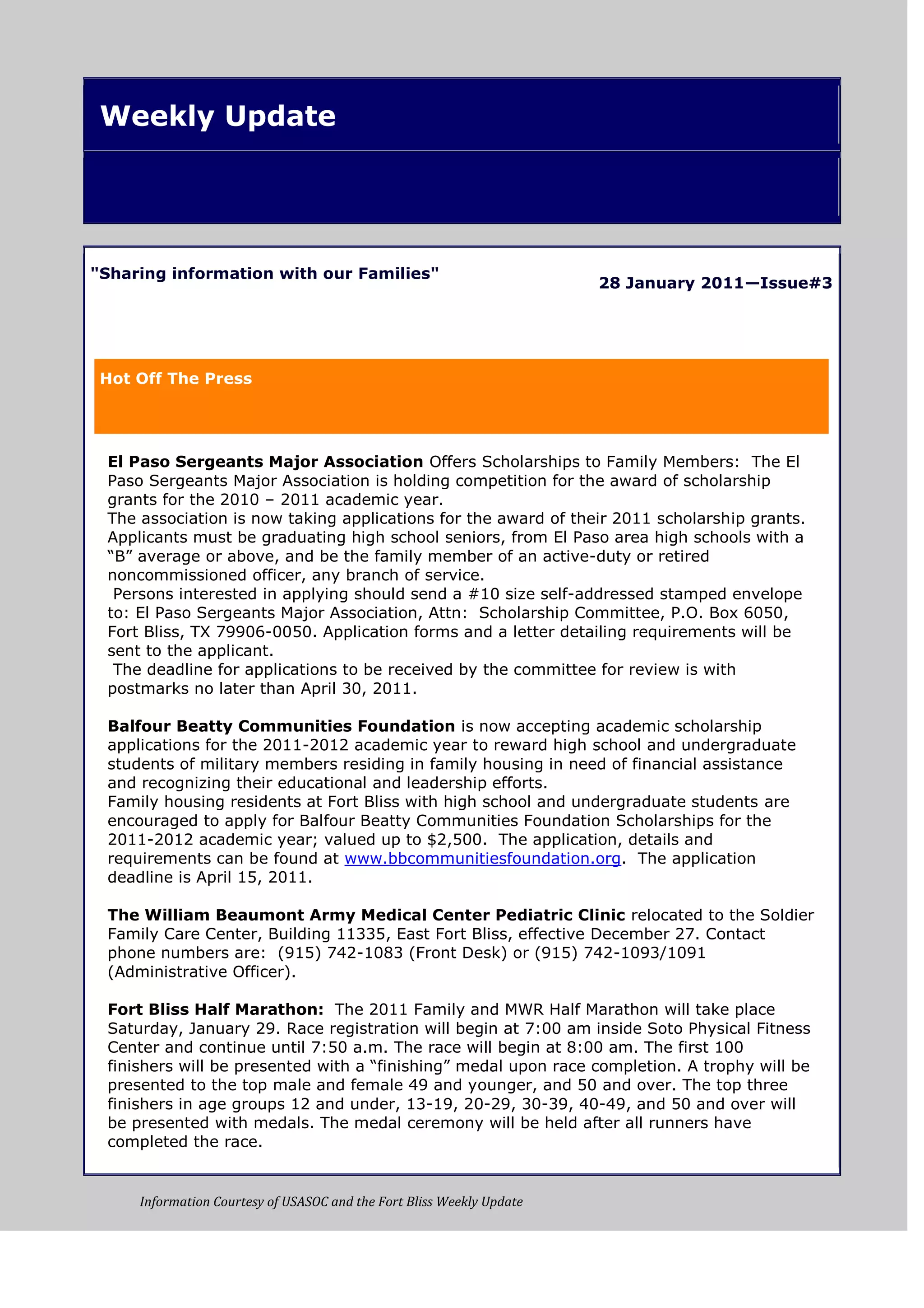 1) The El Paso Sergeants Major Association is offering scholarships for family members of active duty or retired NCOs. Applications are due by April 30th.