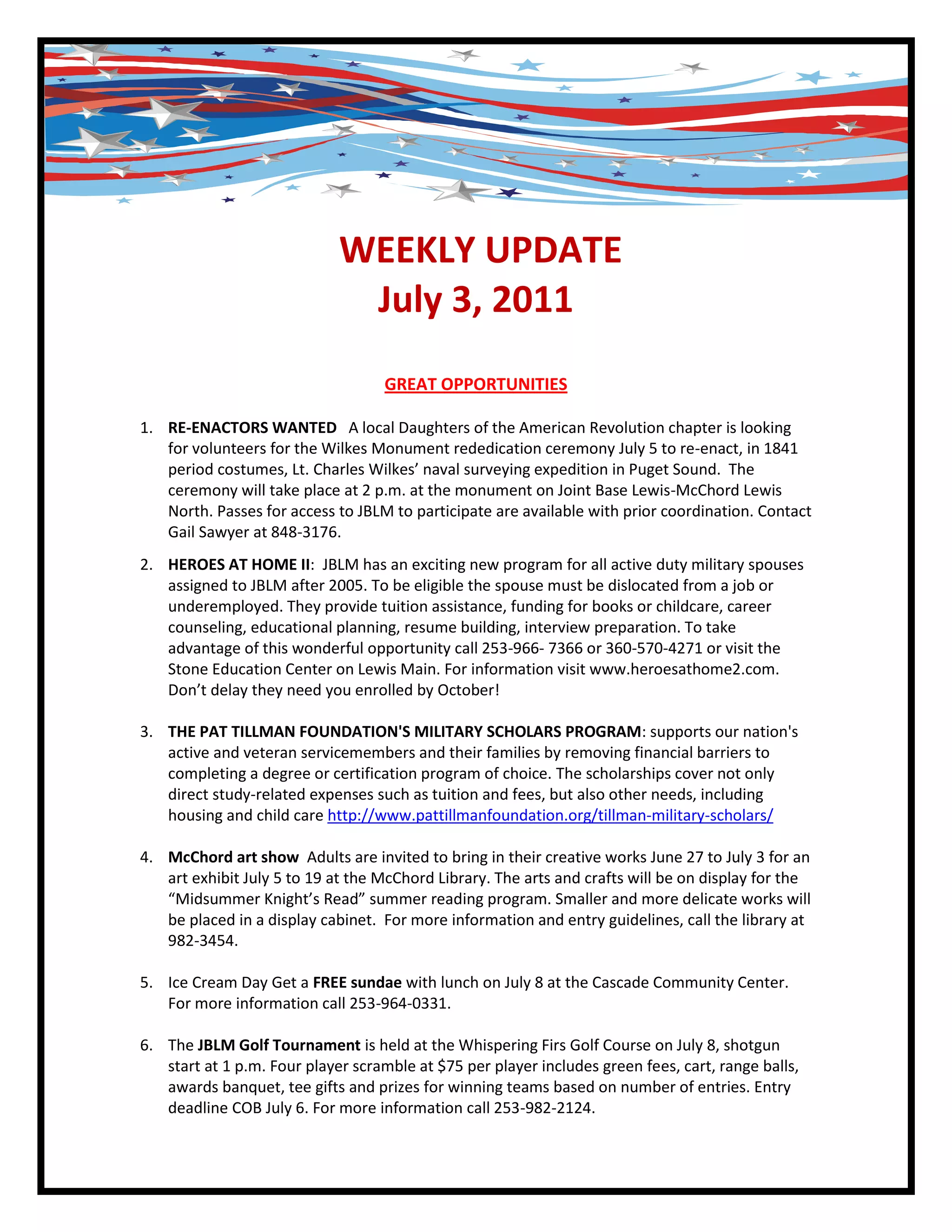 4) Various community and family events happening in early July such as an art show, ice cream social, golf tournament, and trip to Mount St. Helens.