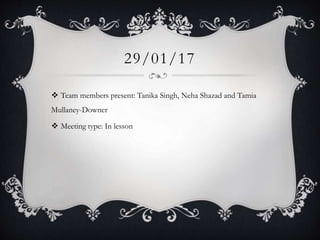 The meeting notes discussed a team meeting where Tanika Singh, Neha Shazad and Tamia Mullaney-Downer were present to review edited footage and provide input on the editor's score notes for the project.