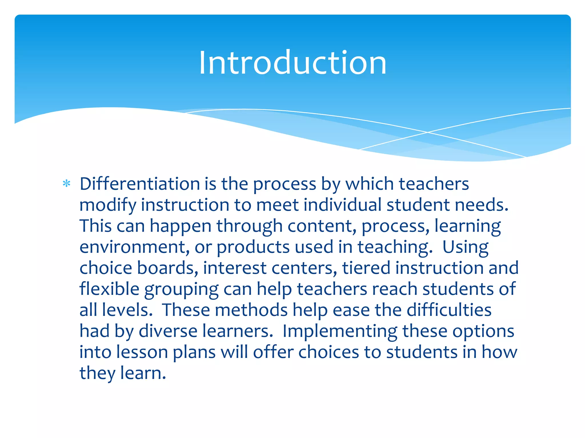 This document discusses trends in differentiation in math and science education. It describes four common differentiation strategies: choice boards, interest centers, tiered instruction, and flexible grouping. It then provides examples of how these strategies can be implemented in both math and science lessons. The document also outlines potential instructional issues and barriers to implementing differentiation. Finally, it includes a sample kindergarten math lesson plan that utilizes centers and tiered instruction to teach telling time.
