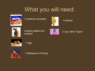 This recipe combines Weet-Bix cereal, pears, banana, egg, honey and yogurt into a layered breakfast stack. The Weet-Bix are crumpled and baked into a base with egg and pear, then slices are layered with mashed pear and banana before topping with yogurt for a portable and guilt-free breakfast option.
