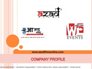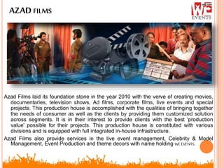 Azad Films, founded in 2010, specializes in film production, event management, and customized solutions for clients across various sectors. Their subsidiary, WeEvents, focuses on a wide range of event management services including corporate functions, weddings, and promotional activities, ensuring memorable experiences tailored to client needs. Azad Films also provides extensive artist and model management, branding, and entertainment services for diverse events.