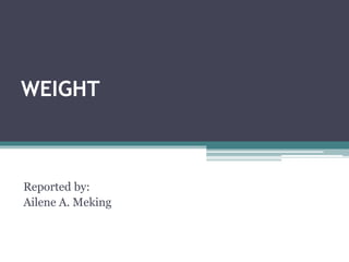 This document discusses the differences between mass and weight. It defines weight as the force of gravity on an object, which can be calculated using the formula w=mg, where w is weight, m is mass, and g is gravitational acceleration. Mass remains constant regardless of location, but weight changes depending on the gravitational force. It provides examples of calculating weight on Earth and the moon using given masses and gravitational accelerations. The key points are that mass is a measure of amount of matter, weight is the gravitational force, and weight can be calculated as mass times gravitational acceleration, which differs on other planets/moons.
