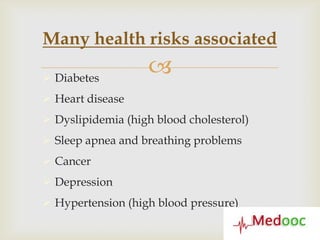 The document discusses definitions and classifications of overweight and obesity, outlining associated health risks, body composition assessments, and risk factors such as environmental influences and genetics. It emphasizes managing weight through understanding caloric intake, exercise, and setting realistic nutritional goals while also addressing eating disorders like anorexia and bulimia. Additionally, it critiques fad diets and emphasizes the importance of sustainable lifestyle changes.