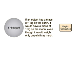 1) Mass is a measure of the amount of matter in an object and remains constant, while weight is the force exerted on an object by gravity and can vary depending on location.
