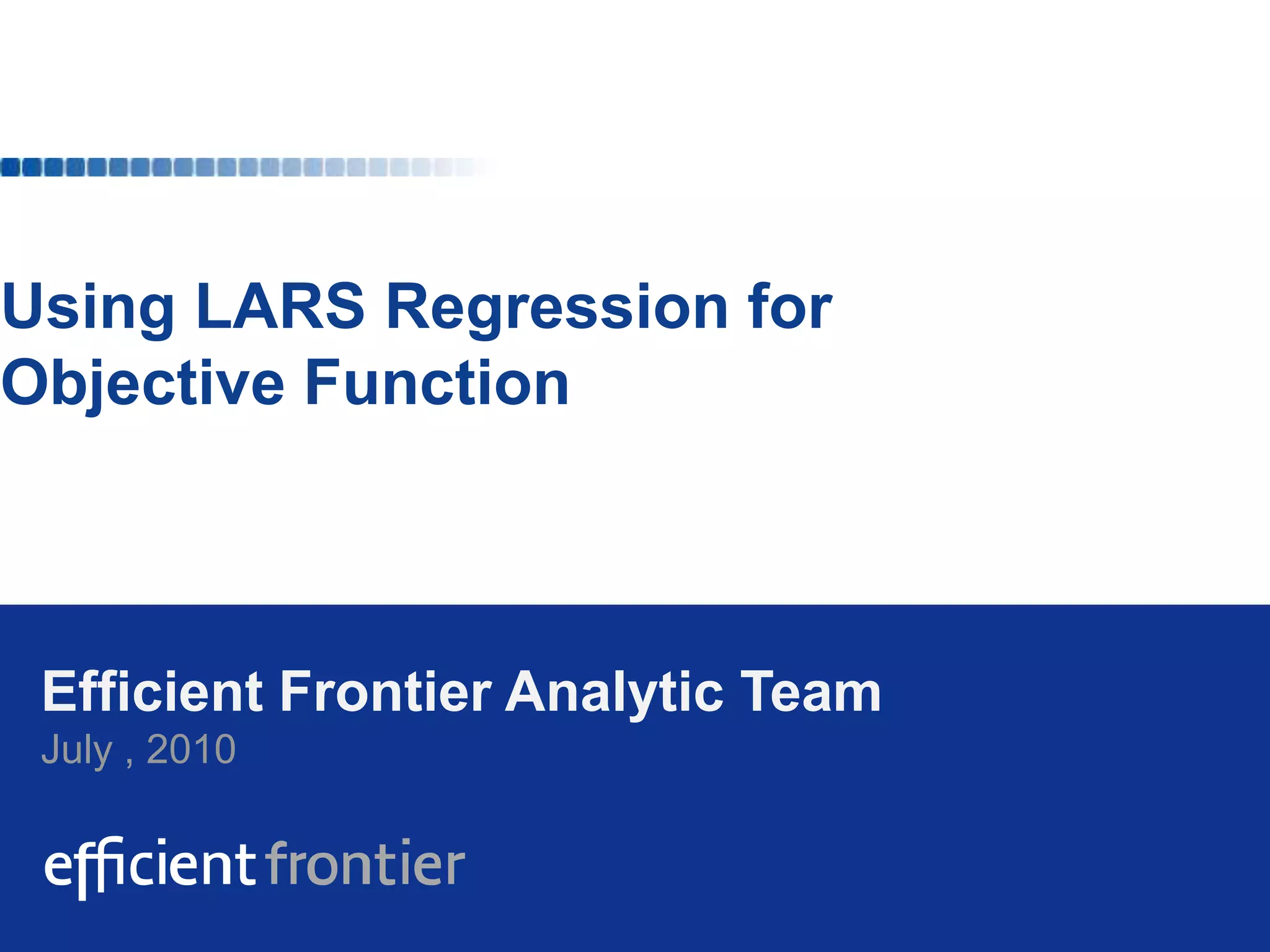 The document discusses using LARS regression to determine the optimal objective function for an efficient frontier analytic team. It analyzes the correlation between loan variables and finds that total loans has a strong correlation with total amount. It uses an LARS algorithm to select a model that best captures the relationship between total loans and other variables with the lowest predictive error. The recommended objective function includes total applications, approved applications, and total loans to capture loan volume and outcomes.